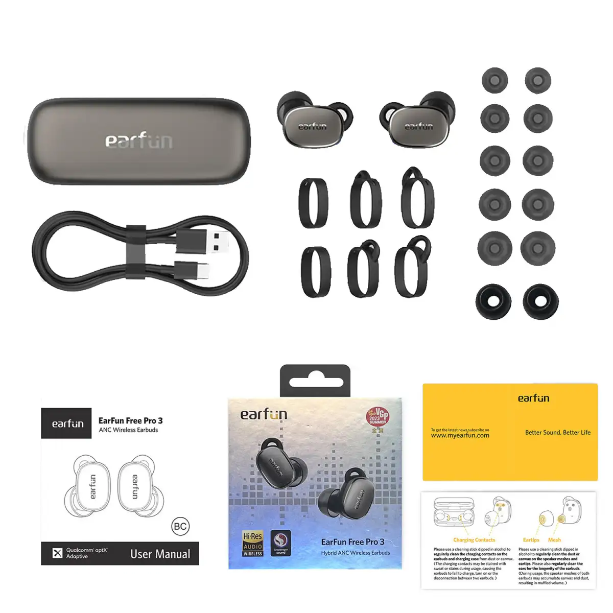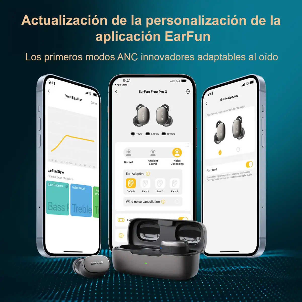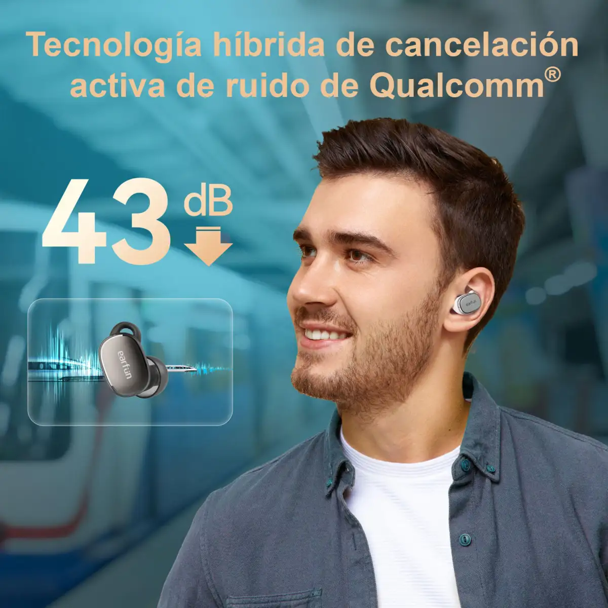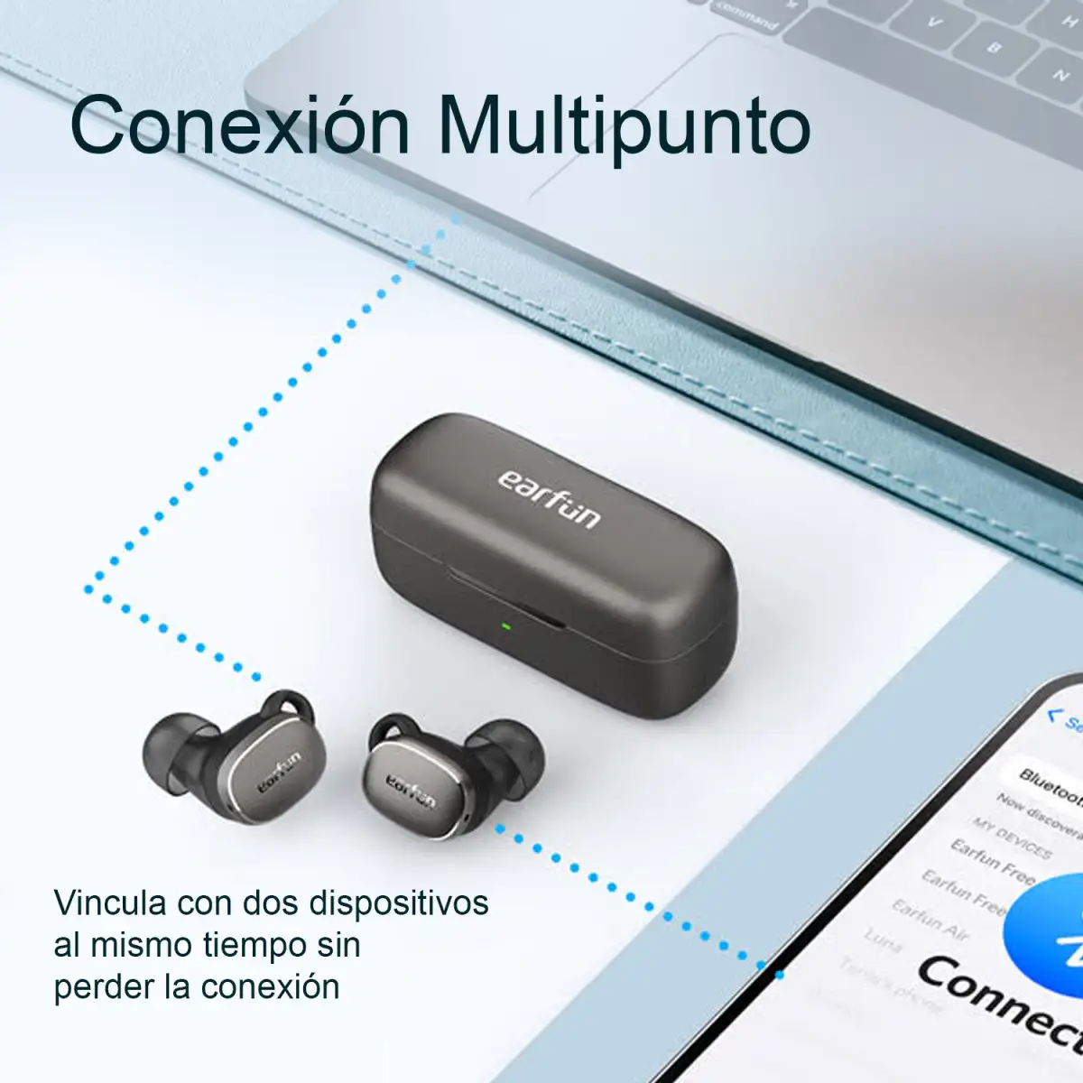 Calidad de los componentes para asegurar calidad de audio. Los Free Pro 3 de EarFun cuentan con Snapdragon Sound con chip Qualcomm QCC3072. Sumado a la compatibilidad Bluetooth de codec aptX Adapative y SBC. Garantizando audio de alta resolución con certificación Hi-Res. ¿Qué significa esto? Que la fidelidad con respecto a la calidad original de la grabación de la canción será mayor. Es decir, se perderá menos calidad desde la reproducción desde tu dispositivo hasta llegar a tu oído. Además, cuenta con 6 micrófonos potenciados por inteligencia artificial para lograr llamadas más claras y nítidas, estés donde estés. En el momento de escuchar música, que solo se escuche la música. Silenciá el ruido exterior con cancelación de ruido activa adaptativa y escuchá solo tu música. En caso de que quieras mantenerte al tanto de tus alrededores cuenta con diferentes niveles de cancelación de ruido elegibles: Alto, medio y bajo. Y también el modo Ambient Sounds para mayor pasaje de sonido a través de tus auriculares. Además cuentan con tecnología de detección de oído, pausa automáticamente tu música con solo quitártelos. Como vos lo quieras vivir, ¡La decisión es tuya! 33 horas totales de música. Hasta 7.5 horas de batería por cada carga completa, más otras 25.5 horas con su caja de carga. Cuenta con carga rápida que transforman 10 minutos de carga en 2 horas de música. Despreocupáte por la batería de tus auriculares, y empezá a pensar en que vas a escuchar únicamente. Tus auriculares, tu manera de vivirlos. Personalización absoluta de tu manera de escuchar mediante ecualizadores predeterminados o armá el que mejor vaya con vos. Creá tu perfil único de escucha que reflejé tu manera de vivir cada sonido. Todo esto desde la APP oficial "EarFun Audio". Incluye una amplia variedad de gomitas para que encuentres el ajuste ideal a tu oído. Y, además incluye gomitas extra para que elijas el agarre al auricular que sientas más cómodo. Es momento de empezar a sentir que tus auriculares son tuyos. ¿Qué incluye la caja? -Auriculares EarFun Free Pro 3. -Caja de carga. -Gomitas intercambiables para oído: 7 pares. -Gomitas intercambiables para agarre: 3 pares. -Cable USB-C. -Manual de uso.