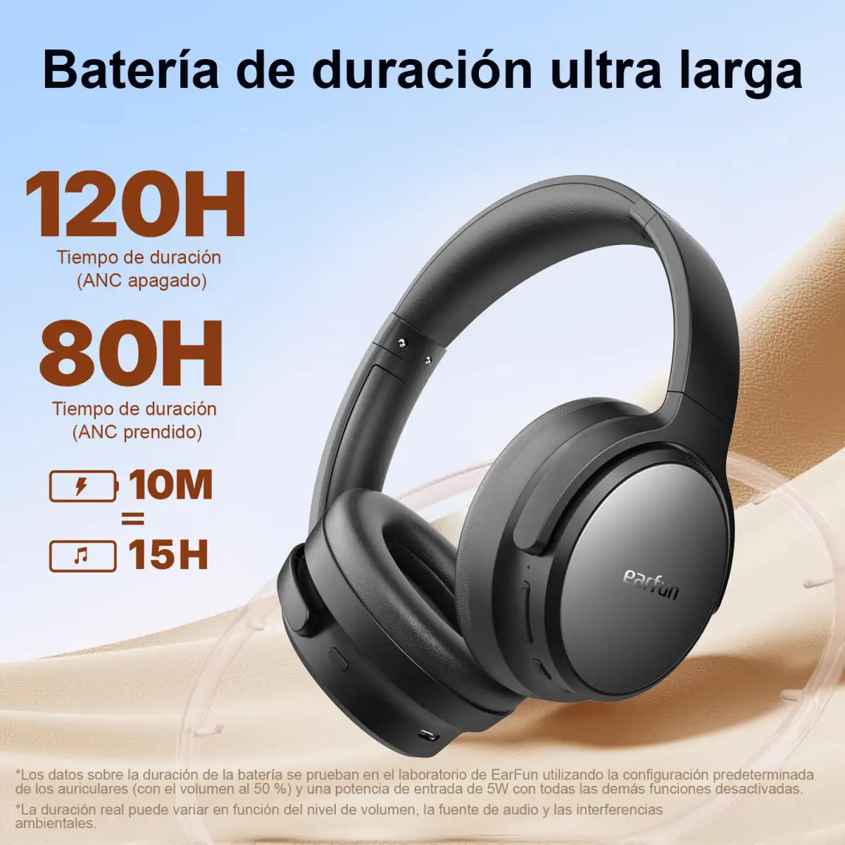 Batería de LARGA duración. ¡Hasta 120 horas de reproducción total! Además de eso, cuenta con carga rápida, para que las pocas veces que haya que cargarlos no pases mucho tiempo sin tus auriculares. Que tu preocupación sea que escuchar, no el tener que estar pensando en si tendrán batería los auriculares. Llegó la revolución. ¡Tus auriculares, tu manera única de usarlos! Personalización absoluta del sonido desde la aplicación oficial "EarFun Audio". Encontrá la ecualización ideal para vos, mediante pruebas únicas desde la APP y viví la música a tu manera. Configurá la funcionalidad de los botones físicos y hasta determina apagado automático para tus auriculares. Llevá la personalización a tu manera de usarlos también: *Vincha ajustable. *Almohadillas de tela respirable con Memory Foam. *Rotación multi ángulos para tu auricular. *Auriculares plegables para mayor practicidad para llevarlos donde quieras. Calidad en todos los aspectos. Resolución de sonido de alta definición (en modo cableado) garantizada por certificación Hi-Res, sumada a cancelación de ruido activa híbrida para aislar tu música del ruido exterior. Drivers duales que combinan lo mejor de bajos potentes y altos nítidos, para una experiencia musical única. Modo baja latencia ideal para jugar sin experimentar delay en el sonido. Viví también una calidad en llamadas superior, con 5 micrófonos potenciados por inteligencia artificial para llamadas mucho más nítidas y claras estés donde estés. ¿Que hay dentro de la caja? -Auriculares EarFun Tune Pro. -Cable Auxiliar. -Cable USB-C. -Manual de uso.